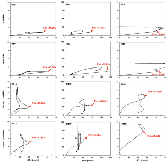 Typical load versus-strain curves recorded in SG1 for beams made from concrete PA (left), PB (central) and PC (right) loaded at 22 m/s (the 1st row), 22 mm/s (the 2nd row), 1.77 m/s (the 3rd row) and 2.66 m/s (the 4th row), respectively.