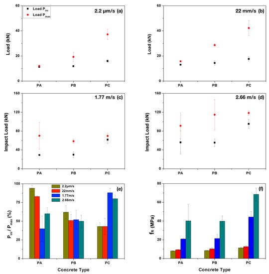 Peak load and initial load (with respective standard deviations) versus concrete type for the loading rate of (a) 2.2 m/s; (b) 22 mm/s; (c) 1.77 m/s and (d) 2.66 m/s, respectively; (e) the ratio between both loads; and (f) the first-crack strength, .