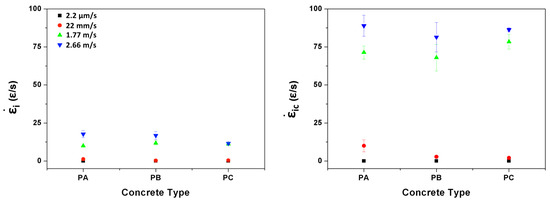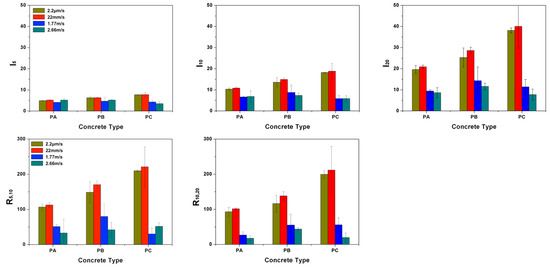 In the case of concrete PC, the beams were not broken even under impact loading due to the fact that the energy supplied by dropping the 120-kg hammer from a height of either 160 mm or 360 mm was not sufficient to break the PC beams. The main crack was more tortuous with numerous micro-cracks formed. The calculated toughness indices, , and , the residual strength factors, and , calculated for concrete PA, PB and PC at four different loading rates are given in Table 5. These results are also plotted in Figure 11 for a better visualization. From Figure 11, it can be observed that, at low loading rates, the energy absorption capability is greatly enhanced with the fiber addition, it is particularly so for PC, which has the highest fiber content. For instance, the values of for PC beams reached 40 when loaded at 22 mm/s, this indicates, at the deflection of 10.5, the beam had absorbed 40 times the energy absorbed at the deflection of , when the first crack was formed. Similar toughness indices were reported by Ríos et al. [26] for ultra-high performance concrete with polypropylene fibers tested at room temperature. By contrast, the values of for PA and PB reached 20 and 30, respectively. Having in mind that a value of 20 for represents a perfectly plastic behavior in average, all three material obtained a strain-hardening tendency accounting from the first-crack formation. This is further confirmed by the residual strength factors, and , shown in the same figure, in which values greater, equal or less than 100% represent a strain hardening, a perfectly plastic or softening behavior, respectively.