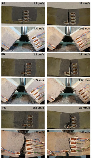 The images of the broken specimens made from the concrete PA, PB and PC at four different loading rates are given in Figure 10. For PA and PB beams, one main crack started at the notch tip and propagated towards the loading point in spite of the fiber content and the loading rate. The difference lies in the fact that, at lower loading rates, this crack did not go through the entire beam whereas at impact loading, the beam broke into two parts. Note that with more fibers, the PB beams present more mist or hackle cracks around the main crack. In addition, the steel fibers are pulled out at the crack surface.