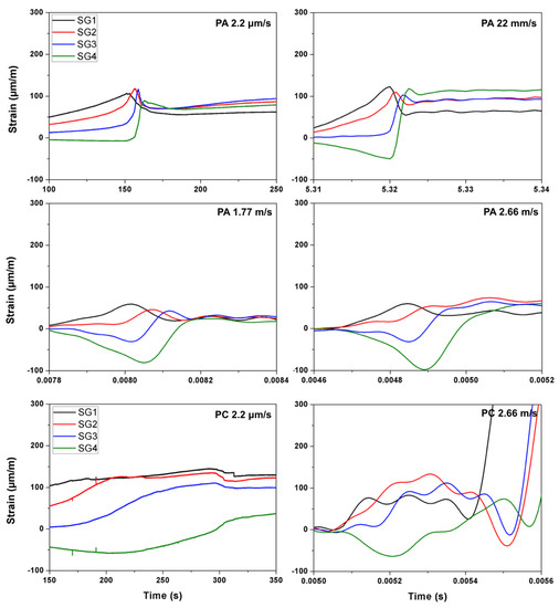 Typical strain-history curves of a PA specimen recorded in SG1–SG4 (loading rate: 2.66 m/s).