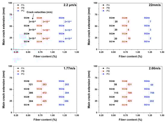 For the convenience of further discussion, the typical strain histories recorded in the gages SG1, SG2, SG3 and SG4 under selected loading rates are presented in Figure 12 for PA and PC. The measured mean crack speed values between two adjacent strain gages are listed in Table 6 and Table 7, the maximum speed obtained are marked out as bold numbers. In addition, due to the fact that the strain gages glued on PB3, PB9 and PA12 failed to record any data, no velocity information was obtained for these three beams. Note that, at the quasi-static loading rate, the main crack speed was in the order of mm/s, the maximum value (15.6 mm/s) appeared in the PA specimens. With the increase of fiber content, the crack propagation slowed down by almost one order of magnitude. When loaded at 22 mm/s, the crack speed reached a maximum of 21 m/s for PA, 14 m/s for PB and 10 m/s for PC, respectively. Under impact loading, the maximum values of 1063 m/s for PA, 708 m/s for PB and 1417 m/s for PC were obtained. In addition, the typical crack velocities marked along the main crack path for concrete PA, PB and PC beams loaded at four different rates are plotted in Figure 13.