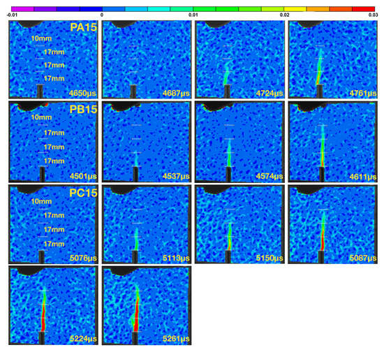 The crack propagation captured using a high-speed camera and processed using a DIC software as strain contours for the specimens PA15, PB15 and PC15 impacted at 2.66 m/s.