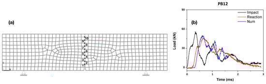 (a) Distribution of mesh in the specimen and ligament nodes; (b) evolution of the numerical and experimental reaction forces contrasted with the impact forces at loading rate of 1.77 m/s (PB12).