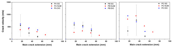 Comparison of the obtained crack velocities using strain gages (SG), digital image Correlation (DIC) and numerical simulations (NUM) for PA, PB and PC beams impacted at 2.66 m/s.
