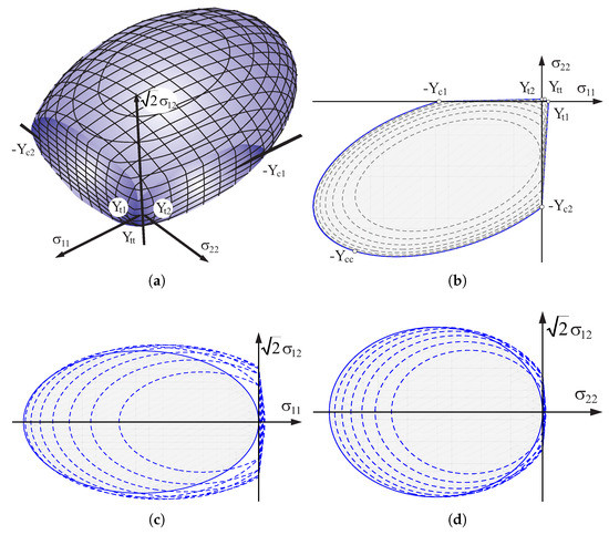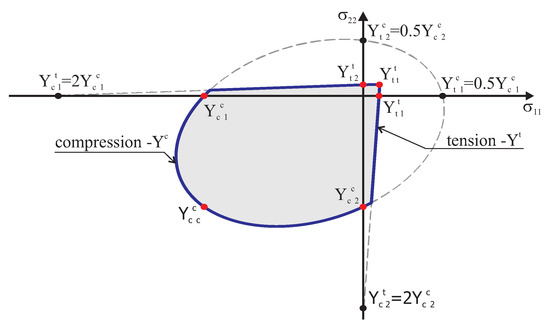 where we have five technical in-plane moduli: are Young’s moduli, is the shear modulus and are Poisson’s ratios (). It should be noted that two yield criteria are combined in the model into a composite yield surface and the intersection of different yield surfaces defines corners that require special attention in a numerical algorithm according to Koiter’s generalization.