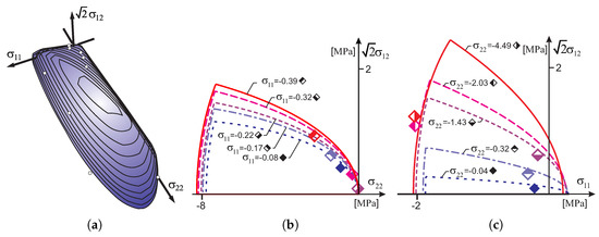 Figure 5a shows the initial surface of the criterion with points marked on the surface, indicating the stress limits of individual experimental tests conducted by Ganz and Thürliman. Analyzing the contour lines, it can be seen that most of the safe area is limited by the tensile regime. This is more clearly seen in Figure 5b,c, in which the plane cross-sections of the criterion are shown. One can see cross-sections with assigned to them, the values of the ultimate stress obtained from the individual experimental tests which are marked with diamonds.