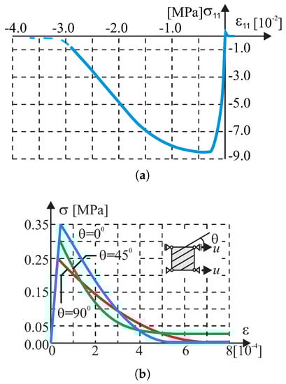 Single-element test results. Relationship : (a) compression along 1(x) axis, (b) tensile softening in the direction rotated by an angle to the first orthotropy axis.