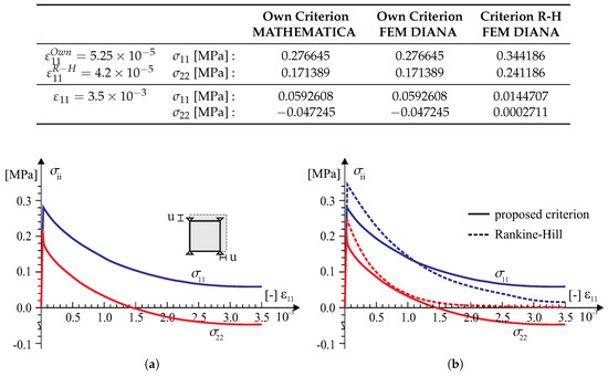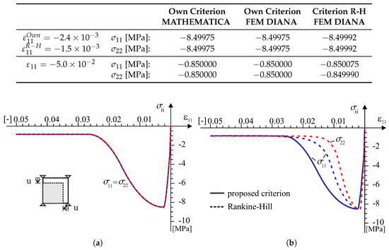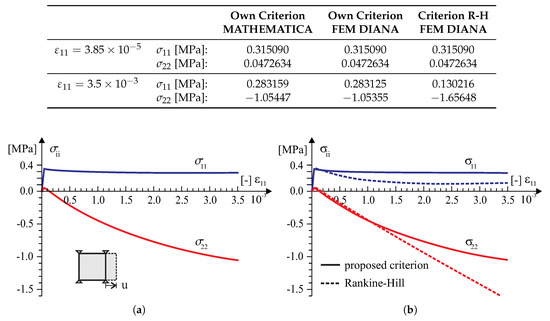 In the test with the homogeneous deformation field, all eight degrees of freedom in the four-node finite element were fixed to force the desired linear deformation. To compare the behavior of our model in the tests, the model of the Rankine–Hill criterion was used, which is standard in the DIANA system and dedicated to the analysis of masonry structures. The following parameters of the Rankine–Hill model are adopted: , , = , , , , , where [MPa] and the tensile fracture energies [J/m], [J/m] and the compressive fracture energies [kJ/m] and [kJ/m]. The algorithm of the own model was also programmed in MATHEMATICA. As a result, it was possible to control the correctness of the algorithm and its implementation in both computing environments. Results of the tests are presented in Figure 9, Figure 10, Figure 11 and Figure 12.