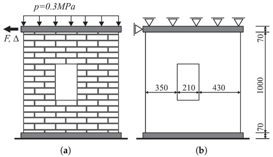 In the second example, the behavior of the masonry infill wall that is built within a reinforced concrete frame is numerically simulated (Figure 18). The wall was experimentally tested in [45]. The frame and the wall were first subjected to the vertical loads kN and kN that remain constant through the subsequent loading steps of the horizontal force up to the failure.