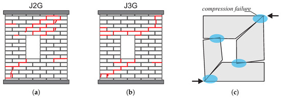 Cracks appeared diagonally between the opening and the lower and upper corners of the wall. In addition, tensile cracks appeared on the outer vertical edges of the wall, on both sides of the opening at the top of the left pillar and at the bottom of the right pillar, and their development ran from the outside to the center of the wall. The failure mechanism resulting from the wall tests is shown schematically in the Figure 14. As can be seen, the kinematics of the system focuses on the movement of four blocks connected by hinges. Due to the development of the material crushing zone, also marked in the drawing, the mechanism will activate the compression criterion.