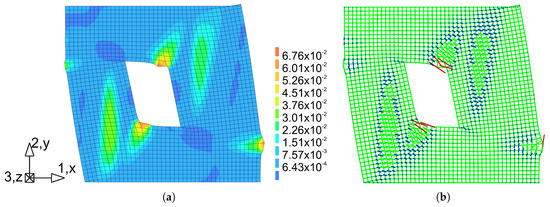 Figure 16 shows the principal plastic strains obtained from own simulations. They can be interpreted as the distribution of material failure zones as a result of exceeding the criterion in tension. These are also zones of development of cracks in the structure. Figure 16a shows the strain results in the form of maps plotted on a deformed finite element mesh. For a better effect, the deformation has been scaled 10 times.