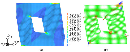 In Figure 16b, the results in the vector form were superimposed on the mesh, wich allows to compare the length of the strain and the direction. Figure 17a shows the principal plastic deformations , which in Figure 17b are shown in vector form. Areas with large strains can be interpreted as zones of material failure due to possible material crushing.
