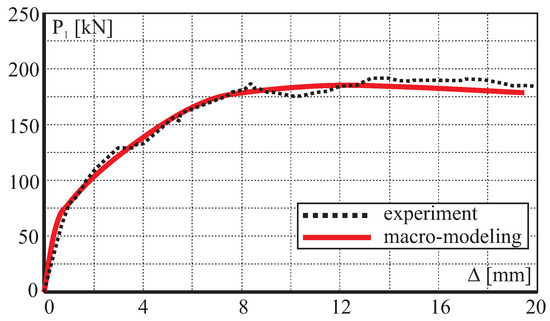 For the numerical analyses 4-noded quadrilaterals, linear plane stress, and continuum elements are utilized. The subsequent loading steps of the horizontal force up to the maximum horizontal displacement = 20 mm were analyzed under a displacement control. The material properties of the model are given in Table 4. The comparison between numerical and experimental load–displacement diagrams is given in Figure 19. The low initial vertical load combined with the confinement provided by the reinforced concrete frame yields extremely ductile behavior.