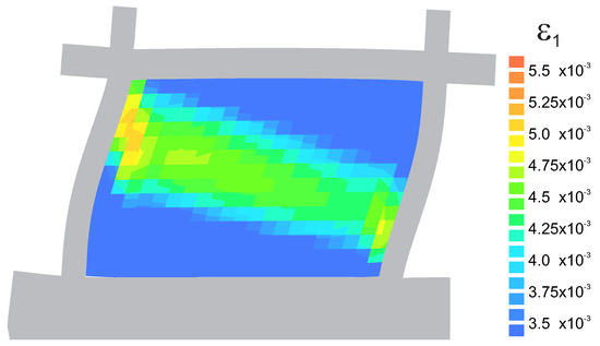 The comparison between numerical and experimental load–displacement diagrams, for wall J2G and J3G, is given in Figure 15. Apart from own calculation, results obtained by Pelá in [44] are also shown. Good agreement is found in the elastic range and satisfactory agreement in the inelastic range, although slightly worse in terms of the load capacity than the results obtained in [44]. The maximum divergence is around 17%. It is possible to better match the results of the experiment, however it requires additional calculations and time-consuming calibration of strength parameters and fracture energies. The behavior of the wall at the horizontal displacement mm is depicted in Figure 16 and Figure 17 in terms of the maximum and minimum principal plastic strains, respectively. Both tensile and compressive failure zones are captured by the model. This indicates that the wall deformability and the general mechanism of its destruction are correctly reflected.