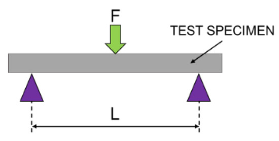 In order to determine the flexural strength, the three-point bending system (installed on MTS Q/Test) was used with respect to PN-EN ISO 178:2011 [14]. Each tested sample with the dimension of 80 × 10 × 4 mm was placed on a bending fixture consisting of two parallel supports (Figure 1). The load was then applied at the center of the specimen with cross head speed of 5 mm/min. The flexural strength was calculated using the Equation (2):
