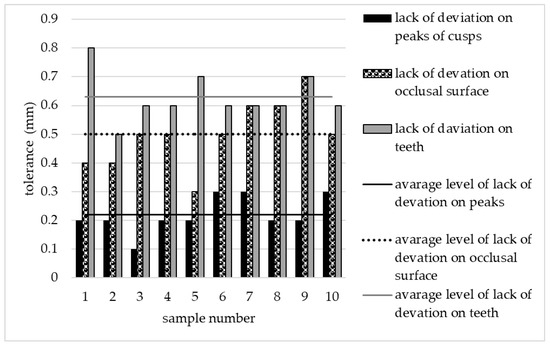 The deviation of the samples on three levels: peaks of cusps, occlusal surface, and teeth’s crowns.