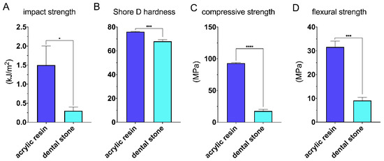 Figure 4 represents mechanical properties of two different materials tested in this study. The disintegration of stone and acrylic specimens was observed during impact strength evaluation. According to Figure 4C, the impact strength for acrylic and stone samples was 1.5 ± 0.7 kJ/m2 and 0.3 ± 0.1 kJ/m2, respectively. Shore Durometer hardness type D was also conducted, and the values of hardness were 76.0 ± 0.4 and 68.4 ± 1.4 for acrylic and stone samples, respectively (Figure 4D).