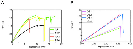 The force/displacement curves of acrylic (A) and stone samples (B) obtained during flexural strength evaluation. AR and DS means acrylic resin and dental stone, respectively (1–4 are the numbers of tested specimens).