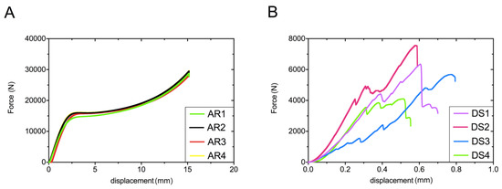The force/displacement curves of acrylic (A) and stone samples (B) obtained during static compression test. AR and DS means acrylic resin and dental stone, respectively (1–4 are the numbers of tested specimens).