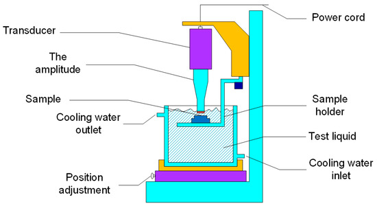 Ultrasonic cavitation equipment conforming to the ASTM G-32 standard [25] was adopted. The vibration frequency was 20 kHz and the amplitude was 50 μm peak-to-peak. The schematic diagram of the cavitation erosion device used in the current work is shown in Figure 1.