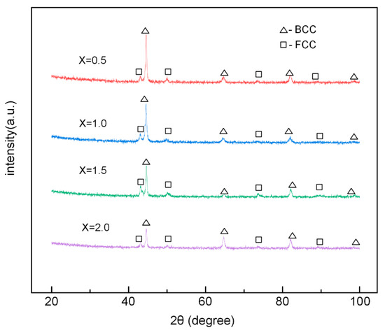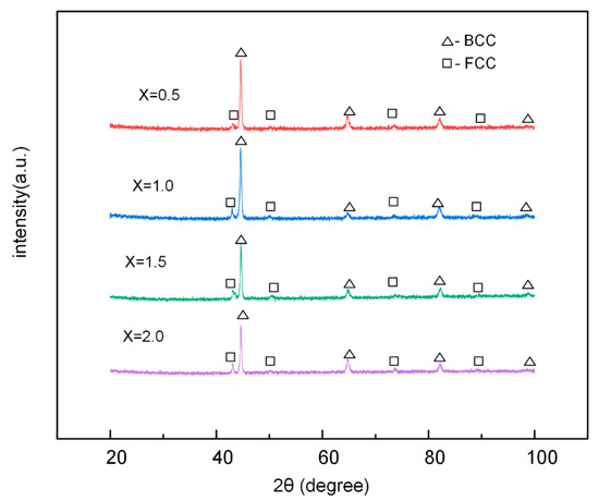XRD (X-ray diffraction) patterns of AlCoCrxCuFe HECs.