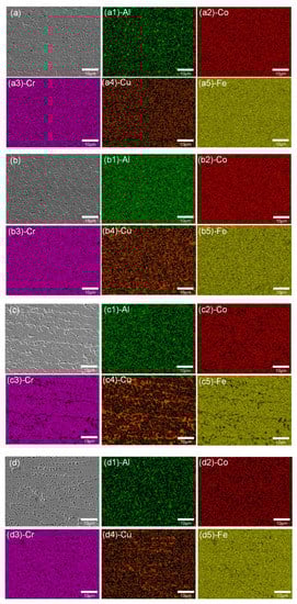 As shown in Figure 3, the microstructure of HECs was composed of dendrite (DR) structures and interdendrite (ID) structures. Laser cladding technology has the characteristics of high cooling rate (106 K/s), and the solidification process of molten pool is non-equilibrium solidification [34]. The atoms do not have enough time for complete diffusion and composition homogenization, which makes the microstructure of the cladding layer show a dendrite structure [35]. Combined with EDS mapping and XRD results, the DR structures of the BCC phase were rich in Al, Fe, Cr, and Co elements, while Cu was concentrated in ID to form a copper-rich FCC structure. The enthalpy of mixing between Al and Co was very negative (Table 4), which made them well mutually soluble. Cr and Fe were little different in atomic radius and similar properties, therefore, they were mainly concentrated in the DR region to form BCC phases. A large number of Cu elements were enriched between the ID region because of the high enthalpy of mixing between Cu and other elements, which prevented Cu from existing in the DR region. Moreover, the poor binding ability with other elements of Cu led to its segregation in the ID region during solidification. In addition, with the increase in Cr content, the peak of BCC decreased, indicating that the content of BCC decreased accordingly.