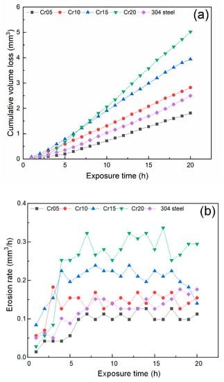 It can be clearly seen that the change in the curve can be divided into three different cavitation erosion periods [7]: one is the incubation period with little material loss, the other is the period with severe material loss; and another stationary period with stable material loss. Cr05 HEC exhibited the lowest cumulative volume loss in all samples. With the increase in Cr content, the 20 h cumulative volume loss increased. This indicated that the cavitation erosion resistance of AlCoCrxCuFe HECs was decreased with the addition of Cr content, reaching its worst at Cr20 HEC. Figure 4b shows the erosion rate curves of the AlCoCrxCuFe HECs. The incubation period of Cr05 HEC was about 4 h. However, Cr10, Cr15, and Cr20 HECs only experienced about 2 h of the incubation period. Unlike from the stable growth of Cr05 HEC and AISI 304 steel in the accumulation period, the growth of Cr10 and Cr15 was very rapid, and they only experienced about 1 h of rapid growth. With the increase in Cr content, the erosion rate of HECs during the cavitation stationary period increased, which was consistent with their 20 h cavitation cumulative volume loss results.