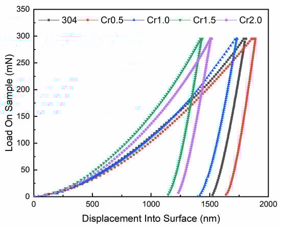 Load-displacement curves in nanoindentation test for AlCoCrxCuFe HECs and AISI 304 steel.