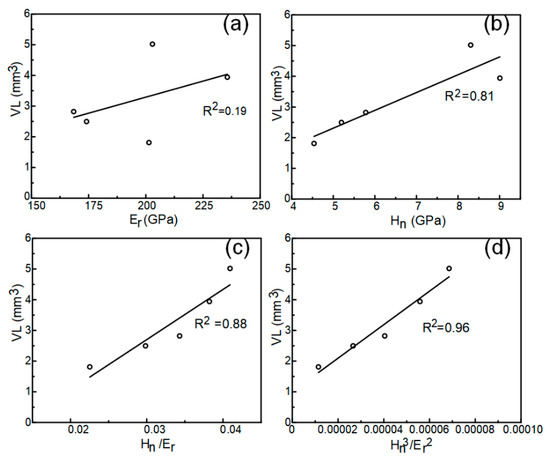 Correlation between the cumulative volume loss (VL) and (a) reduced elastic modulus , (b) nanoindentation hardness , (c) , and (d) /.