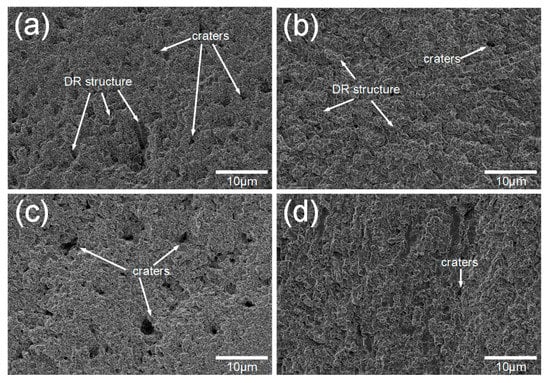 Surfaces of the AlCoCrxCuFe HECs with the 20 h cavitation erosion test: (a) Cr05 HEC; (b) Cr10 HEC; (c) Cr15 HEC; (d) Cr20 HEC.