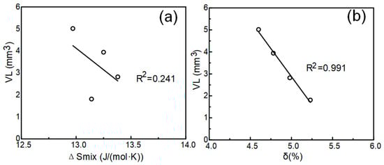 Correlation between the cumulative volume loss (VL) and (a) mixed entropy , (b) atomic radius difference δ.