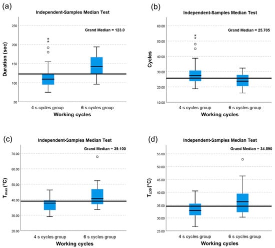 Similar results were found for medians, with statistically significant higher values in the ‘6 s cycles’ group than in the ‘4 s cycles’ one for duration (142.50 s. vs. 108.67 s.; p < 0.0001), Tmax (40.71 °C vs. 37.82 °C; p = 0.02), and T±30 (36.32 °C vs. 32.94 °C; p = 0.02), while means resulted significantly lower in the ‘6 s cycles’ group than in ‘4 s cycles’ one for cycles (23.75 vs. 27.17; p = 0.02).