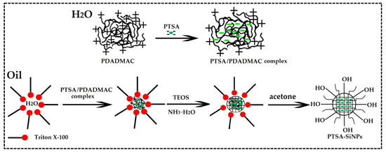 PTSA-SiNPs were achieved as reported in the literature as follows [33]: Triton X-100 (1.77 mL), hexanethol (1.80 mL) and cyclohexane (7.5 mL) were mixed into a 50 mL three port round bottom flask. The mixture was stirred uniformly at room temperature for 30 min; then, the PTSA/PDADMAC complex solution (100 µL) was dripped into the mixture. After the reaction mixture was further stirred for 1 h, TEOS (200 µL) was slowly added to the microemulsion system and stirred for 30 min; finally, ammonia (120 µL) was added to catalyze the reaction, which needed to be stirred for 24 h with the temperature maintained at 25 °C until the end. The product was obtained by adding acetone under centrifugation. Then, it was purified with anhydrous ethanol and ultrapure water 3 to 4 times to remove unreacted materials. Finally, the purified product was vacuum dried. The PTSA solution with the same concentration was added into the reaction system to prepare PTSA-SiNPs as a comparative experiment.