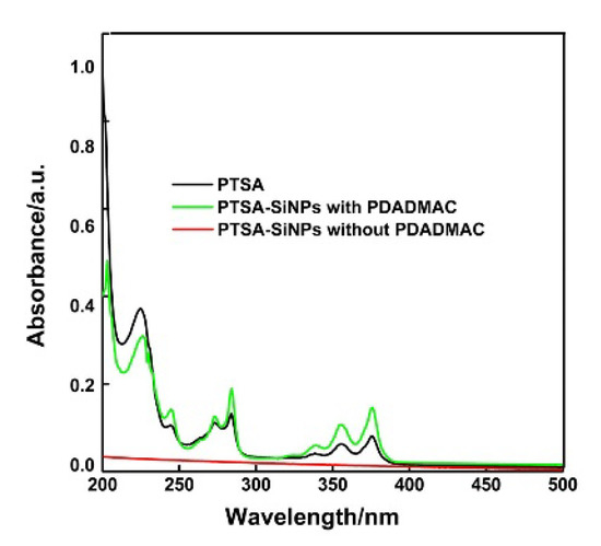 UV absorption spectra of the original PTSA and PTSA-SiNPs prepared with and without PDADMAC as the intermediate in H2O (concentration 10−6 M). The concentration refers to the final concentration of PTSA in the solution. The original PTSA solution was prepared by direct calculation and weighing. PTSA-SiNP suspension solution is prepared based on the absorption spectra of the PTSA at Lambert–Beer law.