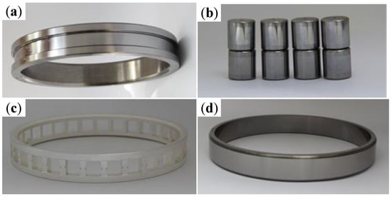 The bearing used in the test consists of an inner ring, a certain number of rollers, a cage, and an outer ring. The inner ring of the bearing contains double stop edges, the outer ring has no stop edges, and each bearing contains 30 rollers, as shown in Figure 1. The detailed structural parameters of the test bearing are shown in Table 1. The inner ring, outer ring, and rollers are made of Cr4Mo4V bearing steel, and the content of each chemical element is shown in Table 2. The cage is made of silicon bronze with silver plating on the surface. In addition to silicon, the cage also contains a small amount of other alloying elements such as zinc, iron, and so on. The detailed compositions of the cage are shown in Table 3.