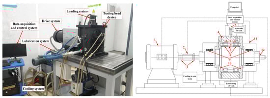 All experiments were performed on the high-speed rolling bearing test rig in the State Key Laboratory of Tribology at Tsinghua University, Beijing, China. As shown in Figure 2, the test rig is mainly composed of a drive system, a cooling system, a loading system, a testing head device, a lubrication system, and a data acquisition and control system. The inner rings of the two test bearings, separated by a retaining ring, are hot mounted at the center of the main shaft with an interference fit. The outer rings, separated by a retaining ring, are cold mounted at the inner side of the sealing cavity with an interference fit. The positioning flanges on both sides of the main shaft and the sealing cavity are used to locate the inner and outer rings of the two bearings axially. Lubricating oil enters the sealing cavity to cool and lubricate the test bearings. Then, the oil flows into the testing head cavity through the oil drain hole under the positioning flanges and it returns the oil tank through the oil pipe. The motor drives the spindle, which is supported by the support bearings on both sides (three on each side) in the testing head cavity, to rotate through the couplings. The motor, lubricating oil tank, and supporting bearings on both sides are cooled by the water. During the tests, the spindle drives the inner rings of the two test bearings to rotate, and the outer rings are fixed (the sealing cavity is fixed on the cavity of the testing head). The rotational speed, radial load, and oil intake are controlled and monitored in real time by the data acquisition and control system. Moreover, the friction torque, vibration acceleration, temperature of the test bearings, and lubricating oil temperature are also monitored in real time by the same system. The range of speed (N) is 0–2.0 × 104 rpm, the range of radial load (F) is 0–5.0 KN, the range of speed acceleration (an) is 0–4.0 × 106 rpm/h, the range of oil intake (L) is 0–4.0 L/min, and the load acceleration (af) is 6.0 × 103 KN/h.