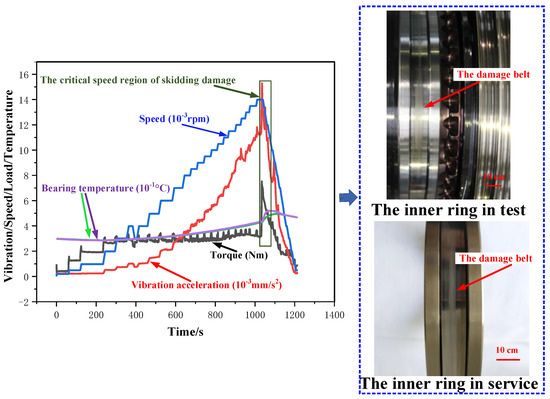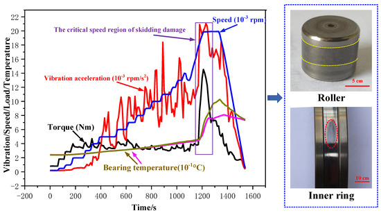 The dynamic behavior curve of the skidding damage of the cylindrical roller bearing is shown in Figure 3. The radial load, oil intake, and acceleration were set as constants, and the speed was increased continuously at the same acceleration value during the test. The friction torque, vibration acceleration, and temperature of the bearings had an instantaneous increase synchronously, and the entire testing head made a large abnormal noise when the speed reached approximately 13,980 rpm. Then, the speed was decreased to zero with the same acceleration and the testing head was disassembled to investigate the test bearings. The black-gray banded wear areas (also known as the damage belt), the two ends of which are shaped like broom, are found in the inner ring of a test bearing, which is consistent with the macroscopic appearance of the inner ring on a bearing that failed by skidding damage that occurs during the service life of certain types of aeroengines. Therefore, it was concluded that the cylindrical roller bearing suffered from skidding damage during the test. According to the bearing dynamic behavior curve, the critical speed for skidding damage can be identified by the sudden and synchronous increases of the friction torque, vibration acceleration, and temperature.