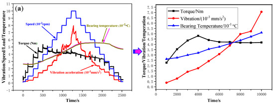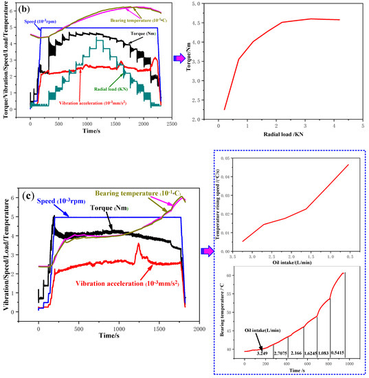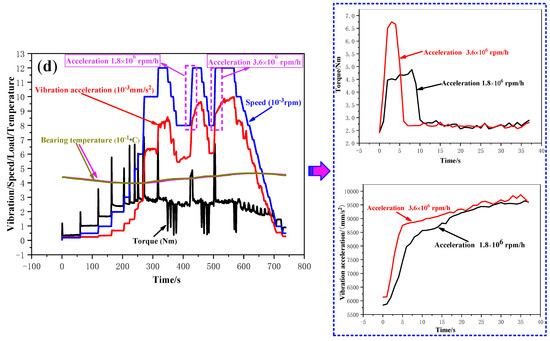 A dynamic behavior curve of the speed acceleration and deceleration can be seen in Figure 5d. The radial load and the oil intake were controlled at unchanged values and only the speed acceleration was changed.