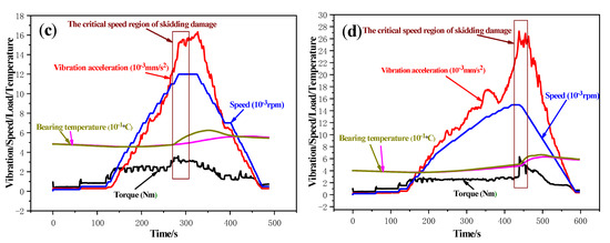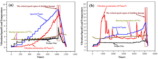 To investigate the skidding damage of the cylindrical roller bearing, four series of tests were conducted, and all the test speeds were increased to critical speeds (Table 5). Moreover, the radial loads and oil intakes were also changed in the tests, and the detailed parameters are shown in Table 5. The dynamic behavior curves are shown in Figure 6.