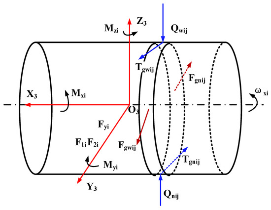 Figure 7 is a schematic diagram of the forces and torques on the roller of the cylindrical roller bearing. The pressures imposed by the inner and outer rings acting on the j-th slice of the i-th roller by means of the lubricating oil film are Fgwij and Fgnij, respectively [21], and the calculation formulas are as follows: