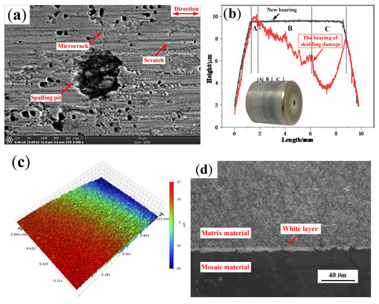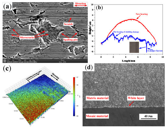 The damage surface of the roller on the skidding damage bearing. (a) Microscopic topography; (b) Profile; (c) Three-dimensional topography; (d) Metallographic microstructure.