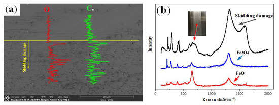 EDX line scanning-spectrum and Raman spectrum of the damage belt on the inner ring. (a) EDX line scanning-spectrum; (b) Raman spectrum.