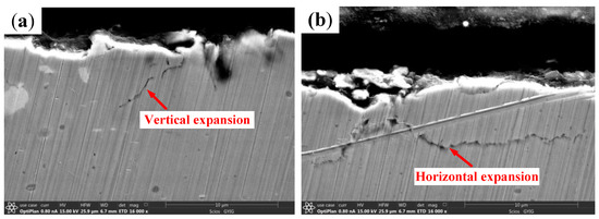 The skidding damage of cylindrical roller bearings are mainly reflected by surfaces of the inner ring raceways and rollers. As can be seen in Figure 8a, a large number of spalling pits with different sizes and microcracks are found on the surface of damage belt. Additionally, a deep furrow appears on the wear surface, and the maximum wear depth of the inner ring is about 8 µm. There are more scratches along the rolling direction in the damage belt as shown in Figure 8c. In Figure 8d, a white layer structure with a thickness of about 3–4 µm is found on the damage area of the inner ring. Furthermore, as shown in Figure 9, the crack of the vertical propagation has a depth of about 5 µm, and the horizontal propagation has a depth of about 2.5 µm and length of about 4 µm.