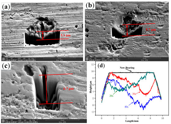 In order to investigate the effect of the operating time at critical speed on the damage of the bearing, the speed did not decrease immediately after the skidding damage occurred, but maintained the critical speed of skidding damage for 20 s, 30 s, and 40 s respectively. It was found that the maximum wear depths of the rollers are about 5.4 µm, 6.5 µm, and 11 µm respectively, and the depths of the typical spalling pits are about 5.1 µm, 5.7 µm, and 6.7 µm respectively, as shown in Figure 13.