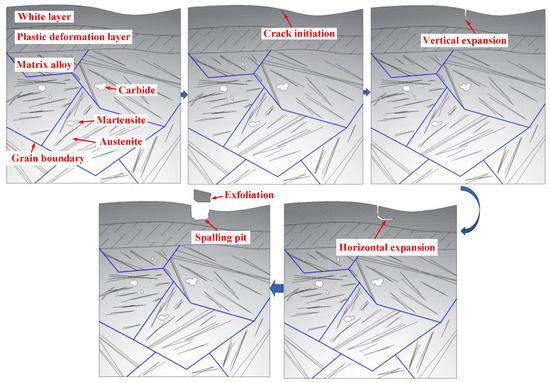 The spalling formation process of the cylindrical roller bearing can be inferred from the cross-sectional topography of the damage area on the bearing, as shown in Figure 14. The white layer is found locally on the bearing surface under the action of the friction heat and the shear force. Subsequently, vertical and horizontal cracks are formed in the white layer, and spalling occurs when the crack is close to the surface. It can be concluded that the deeper the vertical crack propagates, the deeper the spalling pit is. Therefore, the major wear mechanisms of the cylindrical roller bearing of skidding damage include oxidation wear, abrasive wear, and delamination wear.