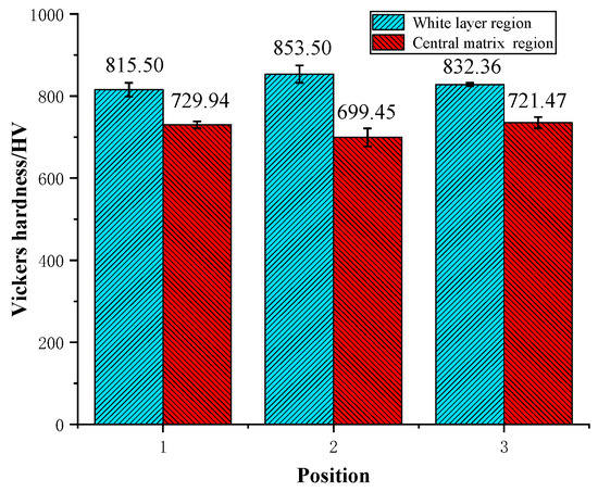A large area of fish-scale spalling pits with different sizes and distributions were found on the damaged surface of the inner ring of skidding burn bearing, and a large number of reticular cracks appeared at the bottom, as shown in Figure 15a. A thick white layer structure was found in the damage area of inner ring, and its maximum thickness is about 180 µm, as shown in Figure 15b. A black reticular transition region appears between the white layer and the central matrix regions, and the grain boundaries can be clearly seen. Vickers hardness measurement was carried out in the white layer region and the central matrix region, and the results indicate that the hardness in the white layer region is higher than that in the central matrix region (Figure 16). Therefore, it can be seen that the bearing has suffered from secondary quenching burns, and the white layer structure is the secondary quenching martensite. This may be because the local flash temperature generated at the moment of skidding burn exceeds the phase transformation temperature of the inner ring structure, which makes the pearlite transform to the austenite, and then it is hardened by a relatively cold matrix to form the quenching martensite. It can be predicted that when the cylindrical roller bearing continues to run at a higher speed after skidding damage, the secondary quenching burn will easily occur, which has great potential safety hazards. Therefore, it is particularly important for large rotating machines to monitor the friction torque, vibration, and temperature of cylindrical roller bearings in real time during actual operation.