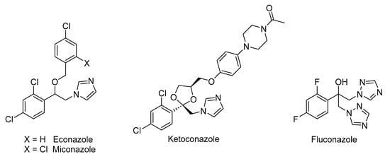 - Wahbi, Y.; Caujolle, R.; Tournaire, C.; Payard, M.; Linas, M.D.; Seguela, J.P. Aromatic ethers of 1-aryl 2-(1H-azolyl)ethanol: Study of antifungal activity. Eur. J. Med. Chem. 1995, 30, 955–962. [Google Scholar] [CrossRef]