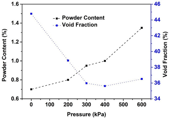 Powder content and void fraction of coarse aggregate as functions of applied shear pressure of the Gyratory Compactor. Note that for the applied pressure of 200 kPa, 300 kPa, and 400 kPa, the powder content was obtained after 500 shearing cycles; and for the applied pressure of 600 kPa, the powder content was obtained after 50 shearing cycles.