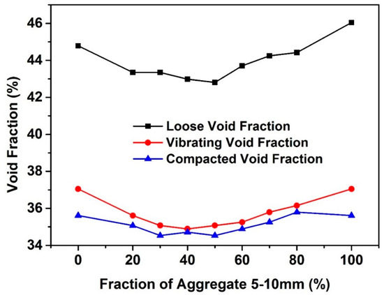 The packing density of aggregates mixtures performed with above three methods were computed through dividing the mass of the aggregates by the volume of the aggregates that occupied in the container. The void fraction of the aggregate mixtures can be obtained by the following formula:
